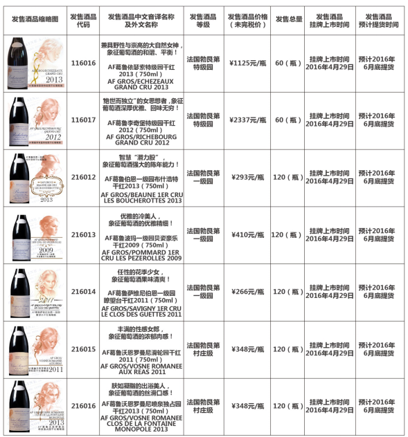 根据《AF葛鲁依瑟索特级园干红2013(750ml)AF葛鲁李奇堡特级园干红2012(750ml)AF葛鲁伯恩一级园布什浩特干红2013(750ml)等酒品发售公告》,下列酒品已于4月15日21时00分发售结束。