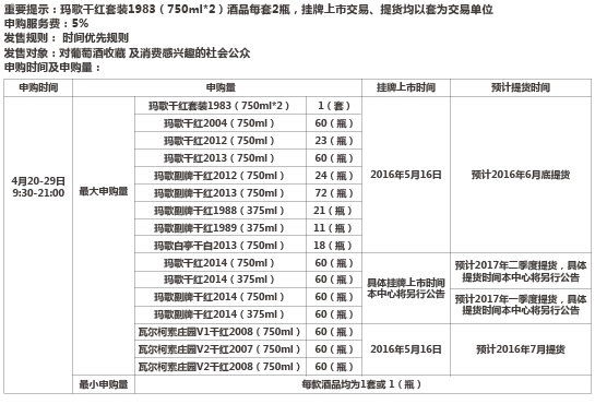 玛歌干红套装1983(750ml*2)玛歌干红2004(750ml)玛歌副牌干红1988(375ml)瓦尔柯索庄园V1干红2008(750ml)等酒品发售公告 上海自贸区红酒交易中心 发售声明 ...