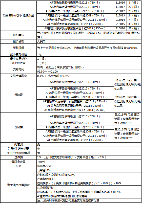 AF葛鲁依瑟索特级园干红2013(750ml)AF葛鲁李奇堡特级园干红2012(750ml)AF葛鲁伯恩一级园布什浩特干红2013(750ml)等酒品挂牌上市公告