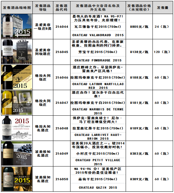 瓦兰德鲁干红2015(750ml)芳宝干红2015(750ml)拉图玛蒂雅克干红2015(750ml)拉图玛蒂雅克干白2015(750ml)小村庄干红2015(750ml)等酒品发售公告上海自贸...