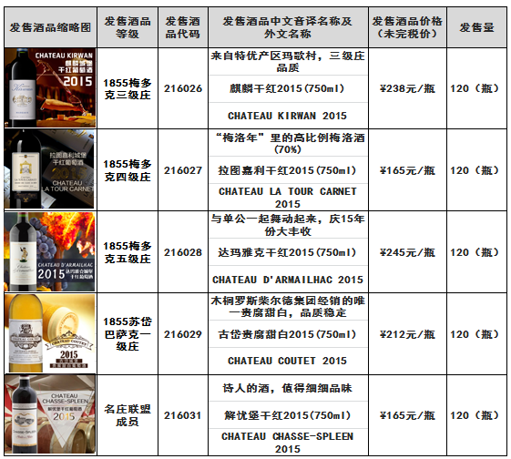 根据《麒麟干红2015(750ml) 拉图嘉利干红2015(750ml) 达玛雅克干红2015(750ml) 古岱贵腐甜白2015(750ml) 克莱蒙教皇干红2015(750ml)等酒品发售公告》,下列酒品已于6月30日21时00分发售结束。`
