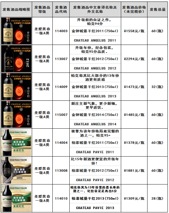 根据《金钟城堡干红2011(750ml)金钟城堡干红2012(750ml)柏菲城堡干红2011(750ml)柏菲城堡干红2012(750ml)等酒品发售公告》,下列酒品已于7月8日21时00分发售结束。
