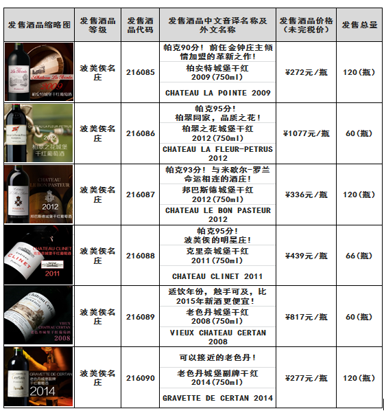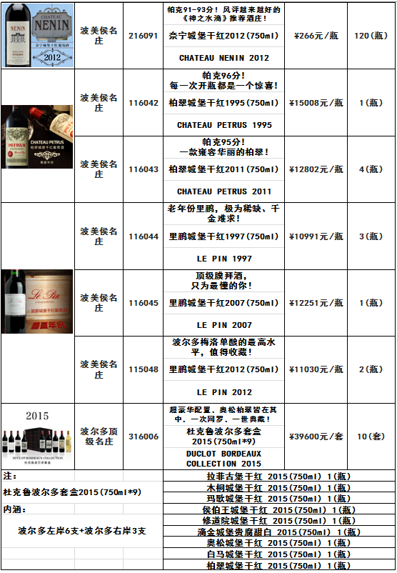 柏安特城堡干红2009(750ml)柏翠之花城堡干红2012(750ml)老色丹城堡干红2008(750ml) 杜克鲁波尔多套盒2015(750ml*9)等酒品发售公告