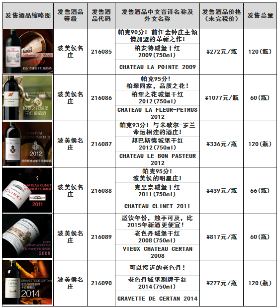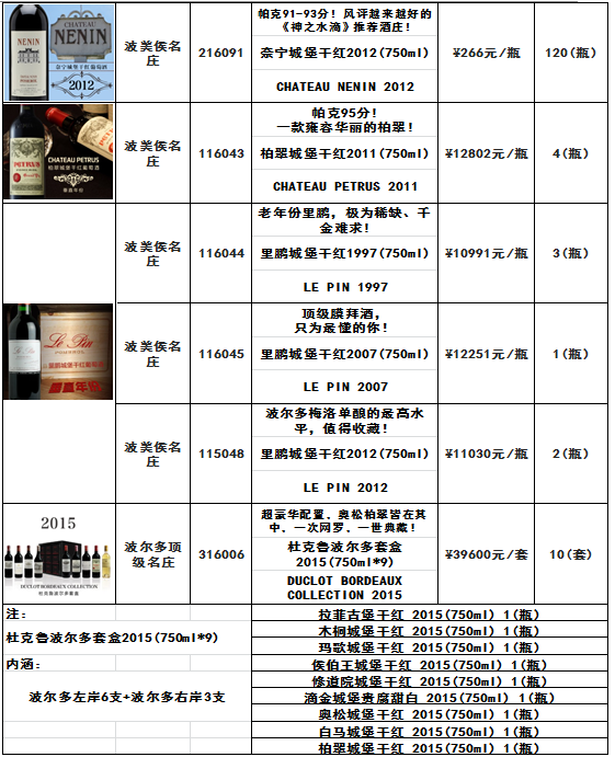 柏安特城堡干红2009(750ml)柏翠之花城堡干红2012(750ml)老色丹城堡干红2008(750ml) 杜克鲁波尔多套盒2015(750ml*9)等酒品发售公告 上海自贸区红酒交易中...