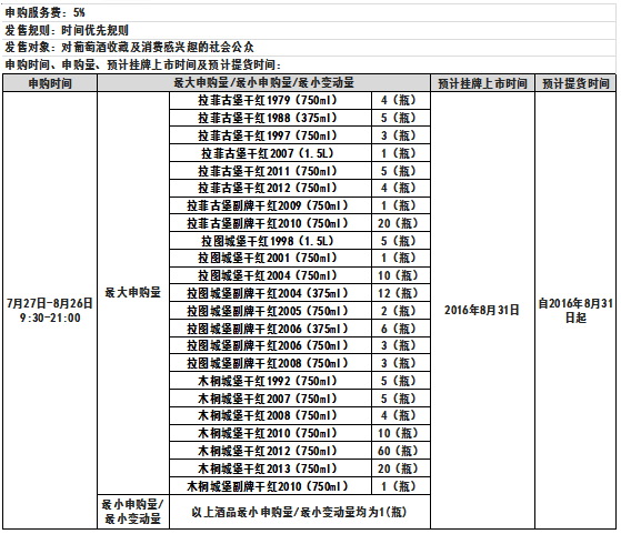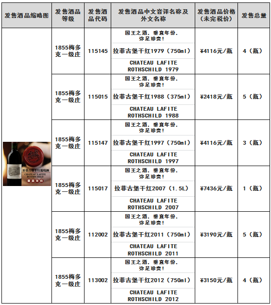 拉菲古堡干红1979(750ml)拉菲古堡副牌干红2009(750ml)拉图城堡干红1998(1.5L)拉图城堡副牌干红2006(750ml)木桐城堡干红1992(750ml)木桐城堡副牌干红2010(750ml)等酒品发售公告