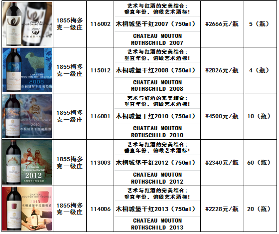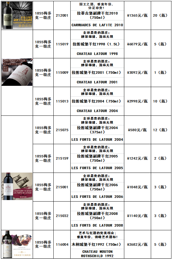 拉菲古堡干红1979(750ml)拉菲古堡副牌干红2009(750ml)拉图城堡干红1998(1.5L)拉图城堡副牌干红2006(750ml)木桐城堡干红1992(750ml)木桐城堡副牌干红2...