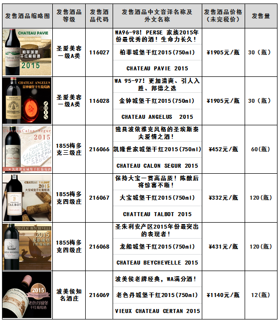 根据《柏菲城堡干红2015(750ml)金钟城堡干红2015(750ml)大宝城堡干红2015(750ml)龙船城堡干红2015(750ml)老色丹城堡干红2015(750ml)等酒品发售公告》,本次柏菲城堡干红2015(750ml) -酒品代码:116027金钟城堡干红2015(750ml) -酒品代码:116028等酒品(详见下述列表)均于8月5日21时00分全部发售结束。