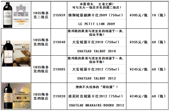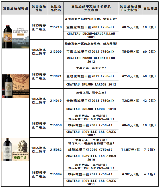 根据《宝嘉龙城堡干红2001(750ml)金玫瑰城堡干红2012(750ml)雄狮城堡干红2007(750ml)雄狮城堡副牌干红2009(750ml)等酒品发售公告》,本次拉格喜城堡干红2007(750ml) -酒品代码:215056及班尼杜克城堡干红2008(750ml) -酒品代码:215048两款酒品于8月9日13时50分发售结束。
