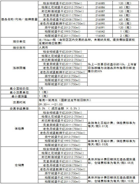 柏安特城堡干红2009(750ml)柏翠之花城堡干红2012(750ml)老色丹城堡干红2008(750ml)等酒品挂牌上市公告