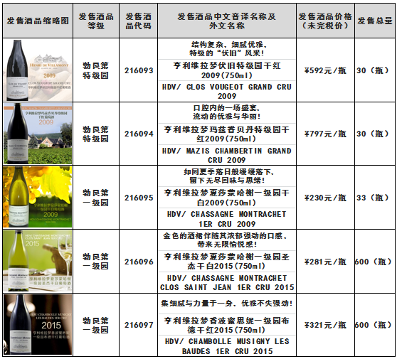 根据《亨利维拉梦伏旧特级园干红2009(750ml)亨利维拉梦玛兹香贝丹特级园干红2009(750ml)亨利维拉梦夏莎蒙哈榭一级园干白2009(750ml)等酒品发售公告》,本次亨利维拉梦伏旧特级园干红2009(750ml) -酒品代码:216093及亨利维拉梦玛兹香贝丹特级园干红2009(750ml)-酒品代码:216094等酒品(详见下述列表)均于8月12日21时00分全部发售结束。