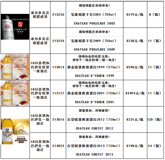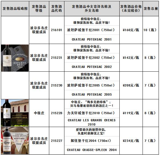 根据《拉拉贡城堡干红2010(750ml)拉图嘉利城堡干红2010(750ml)佳得美城堡干红2011(750ml)等酒品发售公告》,本次拉拉贡城堡干红2010(750ml)-酒品代码:215057、拉图嘉利城堡干红2010(750ml)-酒品代码:213036、佳得美城堡干红2011(750ml)-酒品代码:215040、佳得美城堡副牌干红2011(375ml)-酒品代码:215041及波坦萨城堡干红2000(750ml)-酒品代码:216100五款酒品截止于8月15日11时06分发售结束。