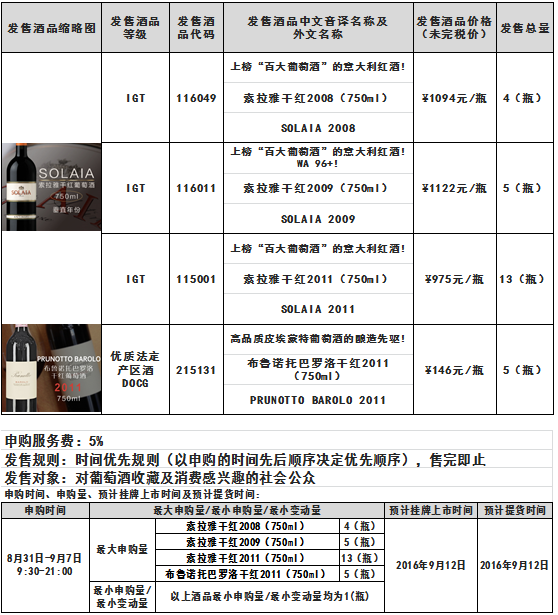 索拉雅干红2008(750ml)索拉雅干红2009(750ml)索拉雅干红2011(750ml)布鲁诺托巴罗洛干红2011(750ml)酒品发售公告