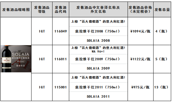 索拉雅干红2008(750ml)索拉雅干红2009(750ml)索拉雅干红2011(750ml)布鲁诺托巴罗洛干红2011(750ml)酒品发售公告上海自贸区红酒交易中心发售声明本发售公告的目的...