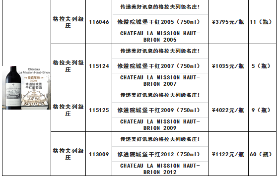 根据《侯伯王城堡干红1990(750ml)史密斯拉菲城堡干红2007(750ml)修道院城堡干红2005(750ml)等酒品发售公告》,本次侯伯王城堡干红1990(750ml) -酒品代码:115116、史密斯拉菲城堡干红2007(750ml)-酒品代码:216102等酒品(详见下述列表)均于9月2日21时00分全部发售结束。