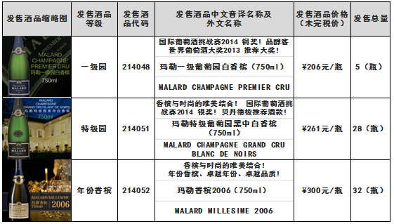 根据《玛勒一级葡萄园白香槟(750ml)玛勒特级葡萄园黑中白香槟(750ml)玛勒香槟2006(750ml)酒品发售公告》,本次玛勒特级葡萄园黑中白香槟(750ml) -酒品代码:214051、玛勒香槟2006(750ml)-酒品代码:214052等酒品(详见下述列表)均于9月2日21时00分全部发售结束。