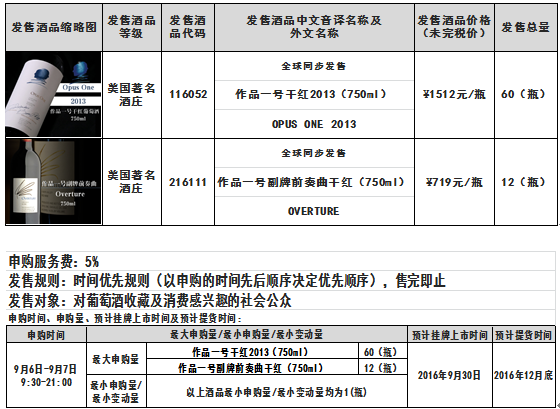 作品一号干红2013(750ml)作品一号副牌前奏曲干红(750ml)酒品发售公告 上海自贸区红酒交易中心 发售声明 本发售公告的目的仅为向公众提供有关本次发售的基本情况,发售公告全文同时刊载在...