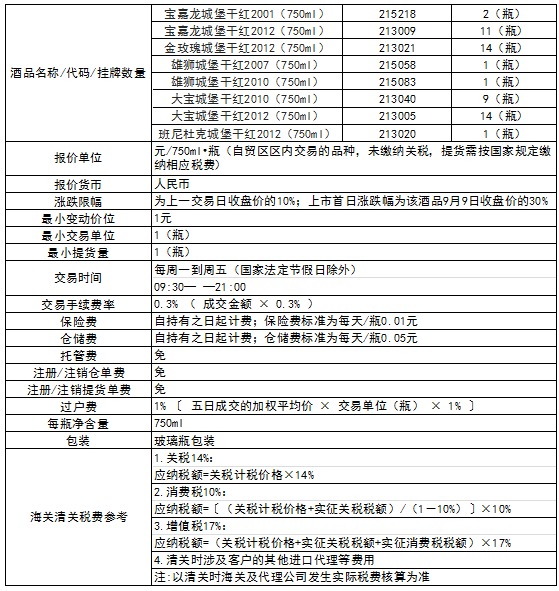 宝嘉龙城堡干红2001(750ml)金玫瑰城堡干红2012(750ml)雄狮城堡干红2007(750ml)等酒品挂牌上市公告