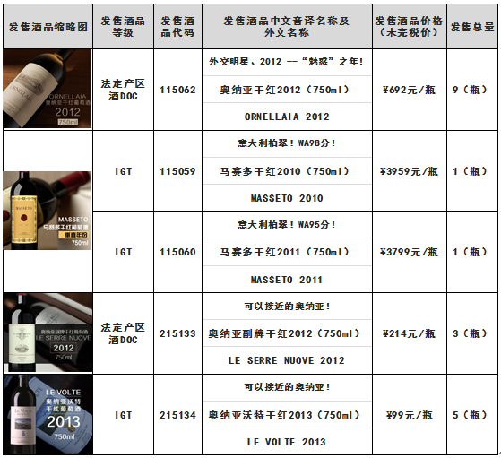 根据《奥纳亚干红2012(750ml)马赛多干红2010(750ml)马赛多干红2011(750ml)奥纳亚副牌干红2012(750ml)奥纳亚沃特干红2013(750ml)酒品发售公告》,本次奥纳亚干红2012(750ml)-酒品代码:115062、马赛多干红2010(750ml)-酒品代码:115059等酒品(详见下述列表)于9月8日21时00分全部发售结束。