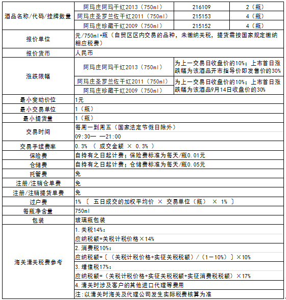 根据《阿玛庄阿玛干红2013(750ml)阿玛庄阿玛干红2014(750ml)阿玛庄圣罗兰佐干红2011(750ml)阿玛庄珍藏干红2009(750ml)酒品发售公告》,本次阿玛庄阿玛干红2013(750ml)、阿玛庄圣罗兰佐干红2011(750ml)、阿玛庄珍藏干红2009(750ml)酒品于2016年9月12日发售结束; 2016年9月19日在本平台挂牌上市交易。
