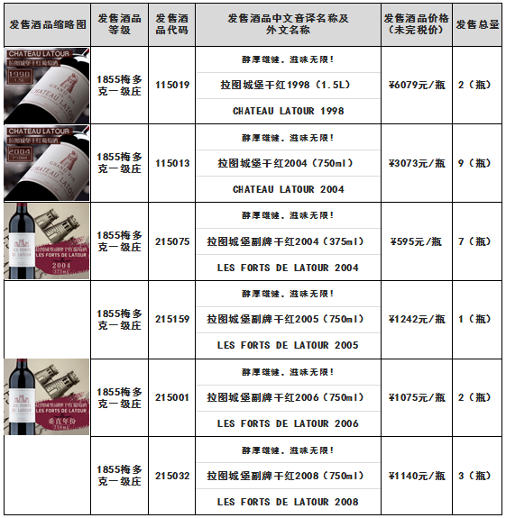 根据《拉图城堡干红1998(1.5L)拉图城堡干红2004(750ml)拉图城堡副牌干红2004(375ml)等酒品发售公告》,本次拉图城堡干红1998(1.5L)-酒品代码:115019、拉图城堡干红2004(750ml)-酒品代码:115013等酒品(详见下述列表)于9月14日21时00分全部发售结束。