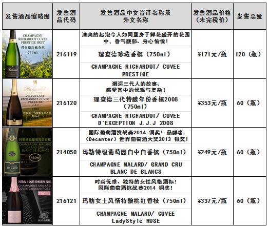 理查德珍藏香槟(750ml)理查德三代特酿年份香槟2008(750ml)玛勒特级葡萄园白中白香槟(750ml)等酒品发售公告