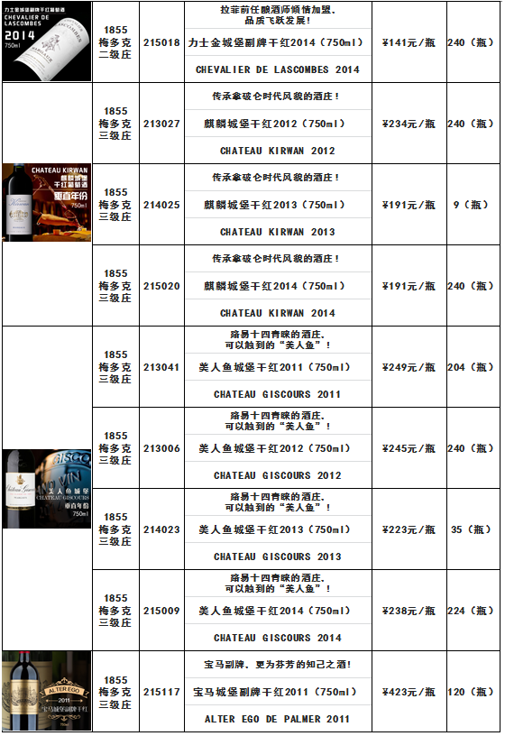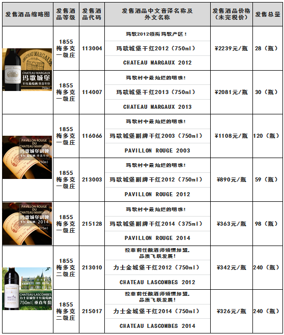 根据《玛歌城堡干红2012(750ml)力士金城堡干红2012(750ml)麒麟城堡干红2012(750ml)美人鱼城堡干红2011(750ml)等酒品发售公告》,本次玛歌城堡副牌干红2014(750ml)-酒品代码:215005酒品截止于10月31日12时12分发售结束。