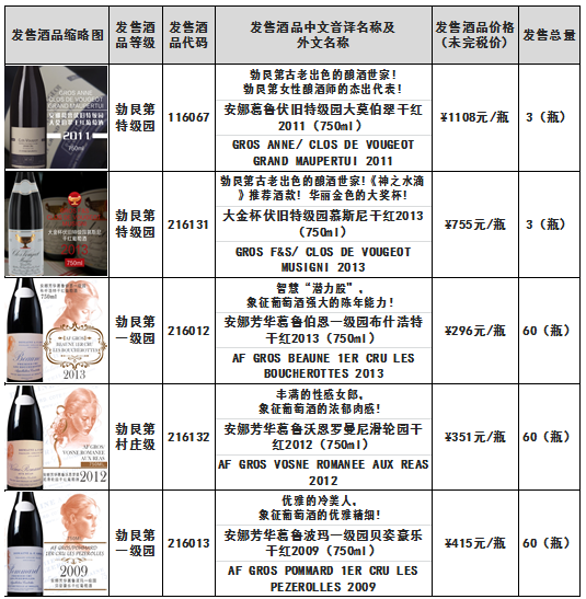 安娜葛鲁伏旧特级园大莫伯翠干红2011(750ml)大金杯伏旧特级园慕斯尼干红2013(750ml)安娜芳华葛鲁伯恩一级园布什浩特干红2013(750ml)等酒品发售公告