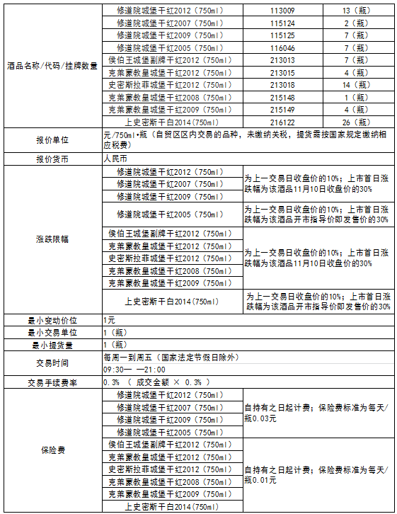 木桐城堡干红2011(750ml) 达玛雅克城堡干红2014(750ml) 克拉米伦城堡干红2012(750ml)等酒品挂牌上市公告根据 《木桐城堡干红2002(750ml)木桐城堡副牌...