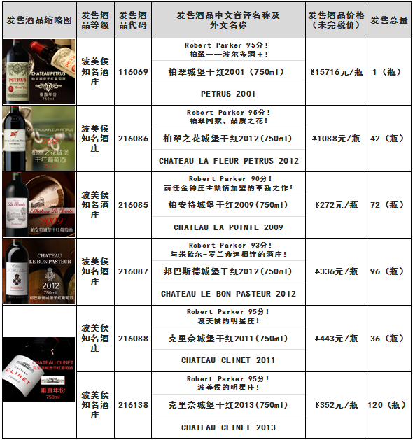 柏翠城堡干红2001(750ml)柏翠之花城堡干红2012(750ml) 老色丹城堡干红2007(750ml)等酒品发售公告