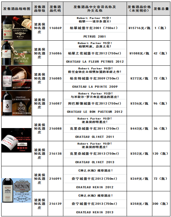 根据《柏翠城堡干红2001(750ml)柏翠之花城堡干红2012(750ml) 老色丹城堡干红2007(750ml)等酒品发售公告》,本次柏翠城堡干红2001(750ml)-酒品代码:116069、柏翠之花城堡干红2012(750ml)-酒品代码:216086等酒品(详见下述列表)于11月18日21时00分全部发售结束。