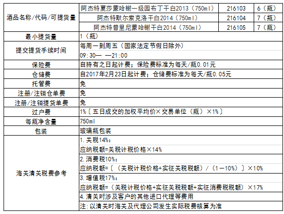 根据 《阿杰特夏莎蒙哈榭一级园布丁干白2013(750ml)阿杰特默尔索克洛干白2014(750ml)阿杰特普里尼蒙哈榭干白2014(750ml)酒品发售公告》, 下列酒品已达上海自贸区红酒交易中心自贸区仓库,自2016年11月23日起,可提交提货手续,办理提货。