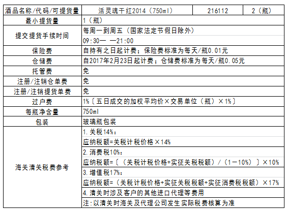 活灵魂干红2014(750ml)酒品可提货的通知根据 《活灵魂干红2014(750ml)酒品发售公告》, 下列酒品已达上海自贸区红酒交易中心自贸区仓库,自2016年11月23日起,可提交提货手续...