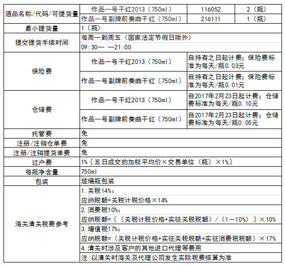 根据 《作品一号干红2013(750ml)作品一号副牌前奏曲干红(750ml)酒品发售公告》, 下列酒品已达上海自贸区红酒交易中心自贸区仓库,自2016年11月23日起,可提交提货手续,办理提货。