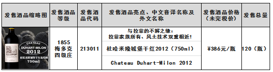 根据《杜哈米隆城堡干红2012(750ml)酒品发售公告》,本次发售的杜哈米隆城堡干红2012(750ml)-酒品代码:213011酒品(详见下述列表)于12月5日21时00分全部发售结束。