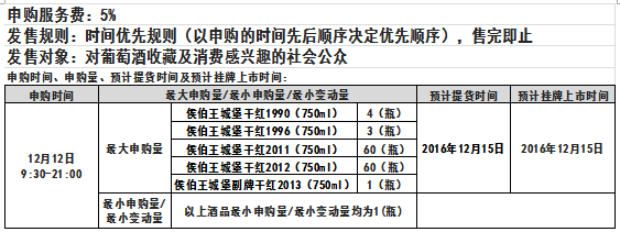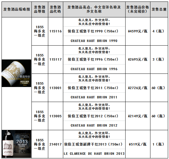 侯伯王城堡干红1990(750ml)侯伯王城堡干红1996(750ml)侯伯王城堡干红2011(750ml)等酒品发售公告