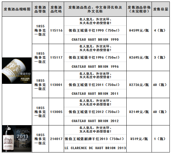 根据《侯伯王城堡干红1990(750ml)侯伯王城堡干红1996(750ml)侯伯王城堡干红2011(750ml)等酒品发售公告》,本次发售的侯伯王城堡干红1990(750ml)-酒品代码:115116、侯伯王城堡干红1996(750ml)-酒品代码:115117等酒品(详见下述列表)于12月12日21时00分全部发售结束。