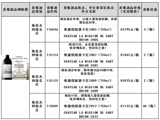 根据《修道院城堡干红2005(750ml)修道院城堡干红2007(750ml)修道院城堡干红2009(750ml)修道院城堡干红2012(750ml)酒品发售公告》,本次发售的修道院城堡干红2005(750ml)-酒品代码:116046、修道院城堡干红2007(750ml)-酒品代码:115124等酒品(详见下述列表)于12月13日21时00分全部发售结束。