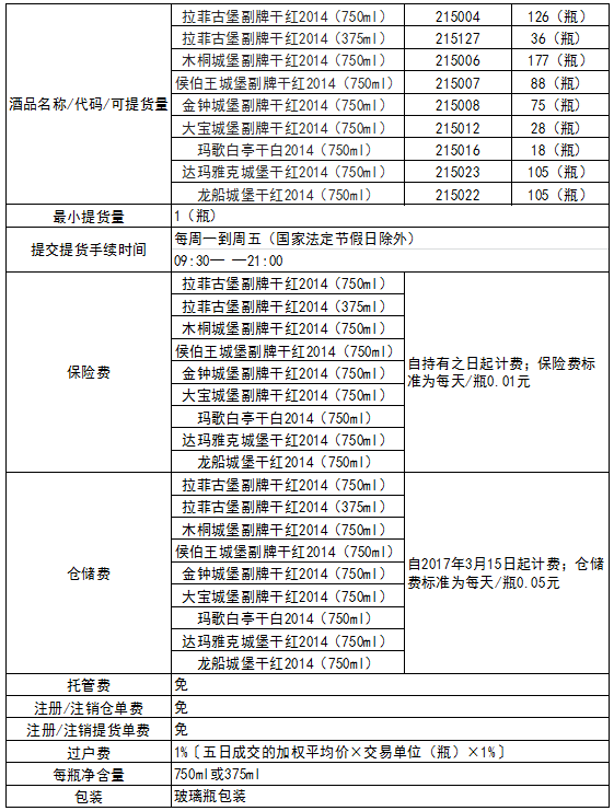 本次可提货酒品相关规定如下表: