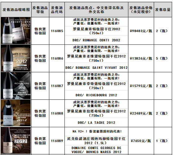 关于罗曼尼康帝特级园干红2002(750ml)-酒品代码:116085武戈伯爵酒庄博纳玛赫特级园干红2012(1.5L)-酒品代码:116089等酒品结束发售的通知