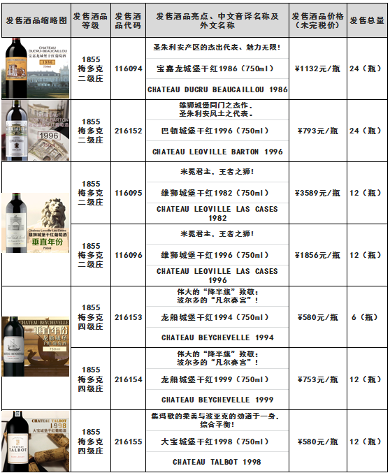 根据《宝嘉龙城堡干红1986(750ml)巴顿城堡干红1996(750ml)雄狮城堡干红1982(750ml)等酒品发售公告》,本次发售的宝嘉龙城堡干红1986(750ml)-酒品代码:116094、巴顿城堡干红1996(750ml)-酒品代码:216152等酒品(详见下述列表)于12月16日21时00分全部发售结束。