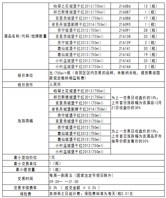 根据 《柏翠城堡干红2001(750ml)柏翠之花城堡干红2012(750ml)老色丹城堡干红2007(750ml)等酒品发售公告》,本次发售的柏翠之花城堡干红2012(750ml) 、老色丹城堡副牌干红2014(750ml)等酒品于2016年11月18日发售结束;2016年12月22日在本平台挂牌上市交易。
