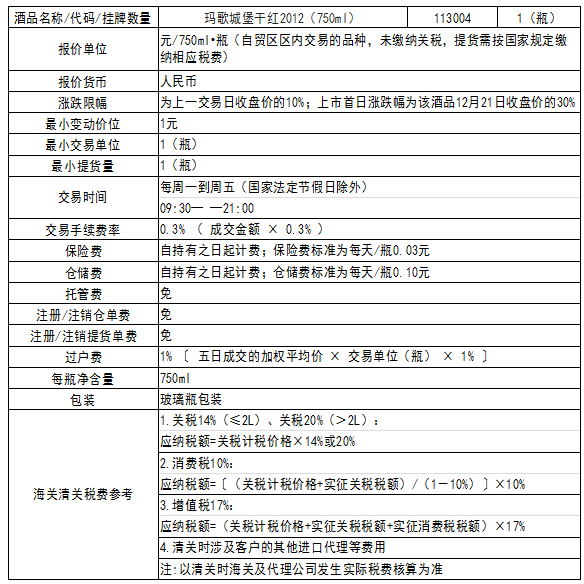 根据 《玛歌城堡干红2001(750ml)玛歌城堡干红2004(750ml)玛歌城堡干红2008(750ml)等酒品发售公告》,本次发售的玛歌城堡干红2012(750ml)酒品于2016年12月19日发售结束;2016年12月22日在本平台挂牌上市交易。