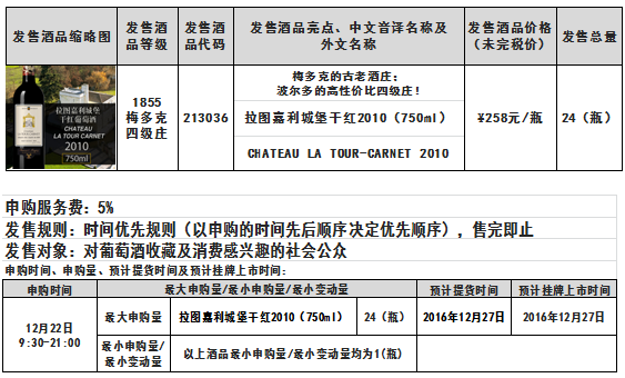 拉图嘉利城堡干红2010(750ml)酒品发售公告上海自贸区红酒交易中心 发售声明本发售公告的目的仅为向公众提供有关本次发售的基本情况,发售公告全文同时刊载在上海自贸区红酒交易中心官方网站[ww...