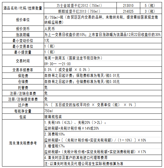 根据 《力士金城堡干红2012(750ml)麒麟城堡干红2013(750ml)酒品发售公告》,本次发售的力士金城堡干红2012(750ml)、麒麟城堡干红2013(750ml)酒品于2016年12月20日发售结束;2016年12月23日在本平台挂牌上市交易。