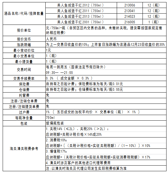根据 《美人鱼城堡干红2001(750ml)美人鱼城堡干红2009(750ml)美人鱼城堡干红2010(750ml)等酒品发售公告》,本次发售的美人鱼城堡干红2012(750ml)、美人鱼城堡干红2011(750ml)等酒品于2016年12月21日发售结束;2016年12月26日在本平台挂牌上市交易。