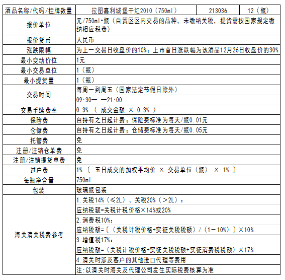 根据 《拉图嘉利城堡干红2010(750ml)酒品发售公告》,本次发售的拉图嘉利城堡干红2010(750ml)酒品于2016年12月22日发售结束;2016年12月27日在本平台挂牌上市交易。