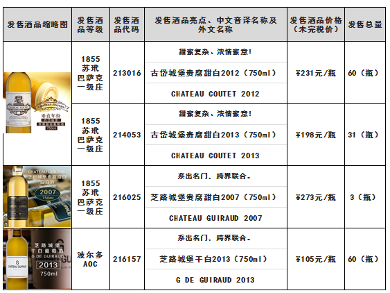 根据《古岱城堡贵腐甜白2012(750ml)古岱城堡贵腐甜白2013(750ml)芝路城堡贵腐甜白2007(750ml)芝路城堡干白2013(750ml)酒品发售公告》,本次发售的古岱城堡贵腐甜白2012(750ml)-酒品代码:213016、古岱城堡贵腐甜白2013(750ml)-酒品代码:214053等酒品(详见下述列表)于12月23日21时00分全部发售结束。