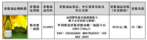 根据《亨利维拉梦夏莎蒙哈榭一级园干白2009(750ml)酒品发售公告》,本次发售的亨利维拉梦夏莎蒙哈榭一级园干白2009(750ml)-酒品代码:216095酒品(详见下述列表)于12月27日21时00分全部发售结束。