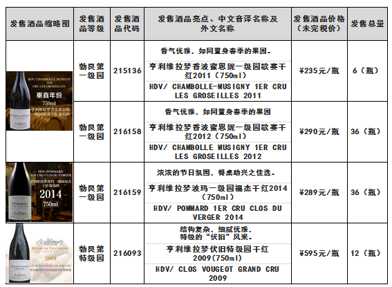 亨利维拉梦香波蜜思妮一级园歌赛干红2011(750ml)亨利维拉梦伏旧特级园干红2009(750ml)等酒品发售公告上海自贸区红酒交易中心 发售声明本发售公告的目的仅为向公众提供有关本次发售的基...
