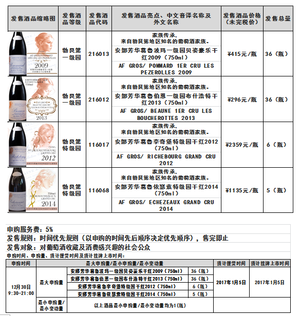 安娜芳华葛鲁波玛一级园贝姿豪乐干红2009(750ml)安娜芳华葛鲁李奇堡特级园干红2012(750ml)等酒品发售公告